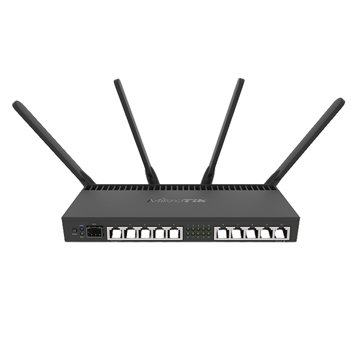 MikroTik RB4011iGS+5HacQ2HnD-IN: 1. المعالج: رباعي النواة Cortex-A15 بسرعة 1.9GHz. 2. الذاكرة (RAM): سعة 1GB. 3. التخزين الداخلي: 512MB نوع NAND. 4. المنافذ: 10 منافذ جيجابت إيثرنت + منفذ SFP+ بسرعة 10Gbps. 5. الواي فاي: ثنائي النطاق (2.4GHz و 5GHz) بمعيار Wi-Fi 5، سرعة تصل إلى 300Mbps على 2.4GHz و 1733Mbps على 5GHz. 6. الهوائيات: خارجية عالية الأداء بتغطية 360°. 7. التغذية الكهربائية: منفذ طاقة DC (12–57V) + دعم PoE-IN على المنفذ 1، وPoE-OUT على المنفذ 10. 8. الاستهلاك: حتى 23W بدون PoE-OUT، وحتى 44W مع PoE-OUT. 9. الأبعاد: 228 × 120 × 30 ملم. 10. مدى حرارة التشغيل: من -40°C حتى +45°C. 11. الرخصة: RouterOS Level 5.